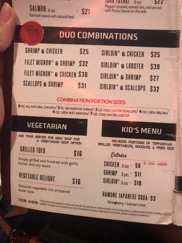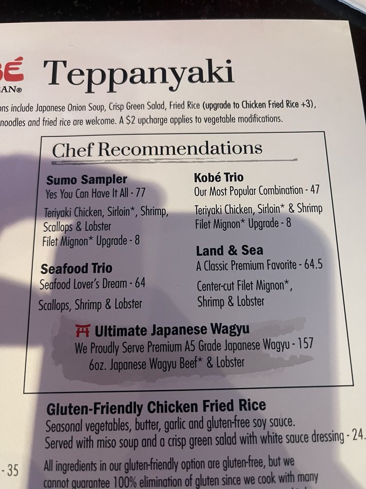 5oz Chicken Teriyaki, 5pc Shrimp with mushrooms, 5oz Center-cut *Sirloin with potatoes. Includes Vegetables, Fried Rice, Kobe Noodles and 4oz Kobe White Sauce.