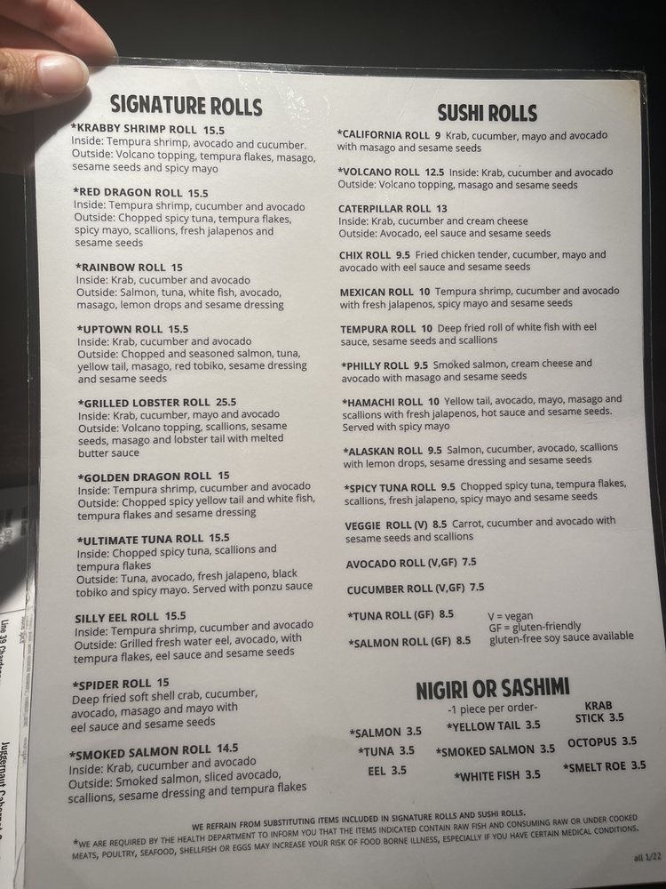 1 *Ultimate Tuna Roll, 1 *Uptown Roll, 1 *Rainbow Roll